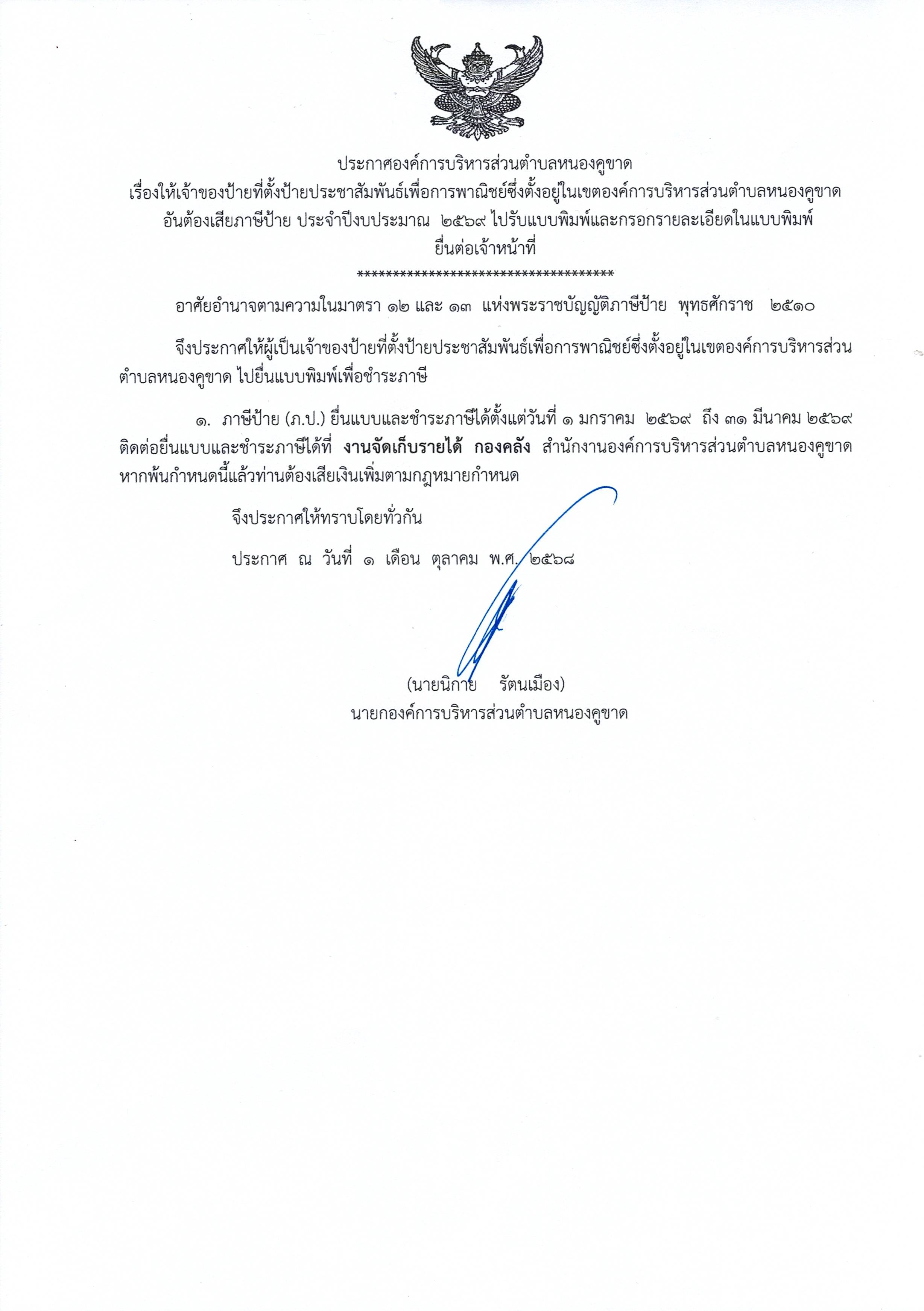 ประกาศ อบต.หนองคูขาด เรื่องให้เจ้าของป้ายที่ตั้งป้ายประชาสัมพันธ์เพื่อการพาณิชย์ซึ่งตั้งอยู่ในเขตองค์การบริหารส่วนตำบลหนองคูขาด อันต้องเสียภาษีป้าย ประจำปีงบประมาณ 2569ลงข่าว: 17/10/2568